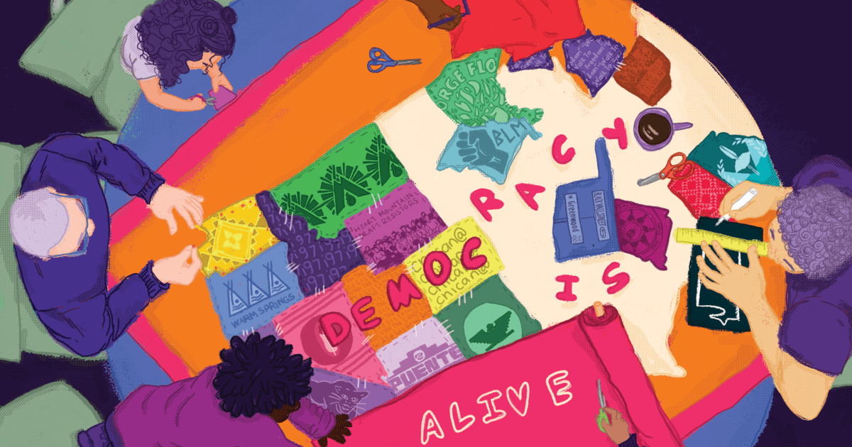 This issue of the Public Eye tells us about both the reality of where we are as a country right now, and how we can fight against the authoritarian forces threatening to take over. For the cover, I wanted to focus more on the latter and center community care and collaboration as the main concepts. The composition shows community members of diverse ages, genders, and races coming together to mend a quilt of the U.S. The quilt serves as a metaphor for the possibility of us coming together as a community to reimagine and rebuild our country. The quilt is unfinished; some states are missing or disconnected, while others are loosely stitched together. It’s an imperfect union where the stitches are obvious, the lines aren’t straight, and colors bleed over into one another. Many of the states highlight names, symbols, or cultural artifacts from different resistance movements that dreamed of an equitable and just future. This emphasis on reimagining and rebuilding is echoed in my color and design choices, from the bright colors to the crooked lines.