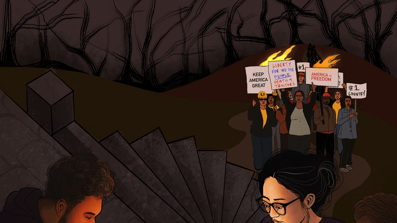 . The concept of this artwork comes from a metaphor used by Ash-Lee Woodard Henderson when describing the book Fire Dreams: Making Black Feminist Liberation in the South. She likened the book to a “blueprint” for creating a better world. I took that metaphor and combined it with an effort to illustrate the tension between two forces: the multiracial Far Right and the coalition working to block their efforts. I wanted to highlight this dichotomy in a way that told a story.