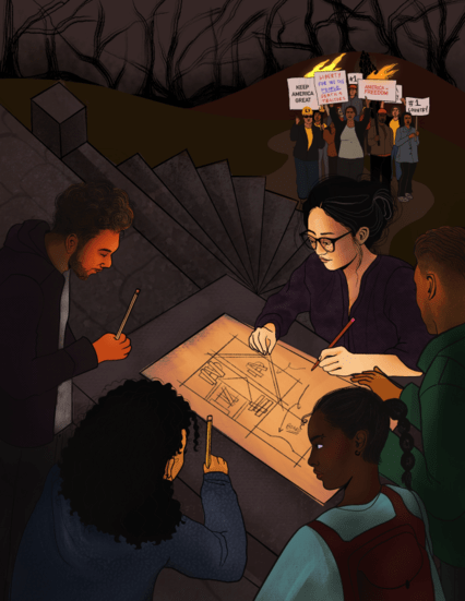 In the foreground, a group of “architects” gather around a table, putting forth a collective effort towards preventative measures—boarding up entry points to a house due to an impending storm. This storm forms behind a group of protesters, the multiracial Far Right, along with barren leafless trees which work to add to this atmosphere of desolation and dark, destructive energy. The spiral staircase not only represents this impending threat of the Far Right but also suggests a divide between these two worlds. The metaphor of this storm speaks to a real threat, and more literally represents conflicting ideologies. On one side, we have a coalition working methodically on a shared plan—a blueprint for resistance, united by a common goal to block the Far Right. In contrast, the