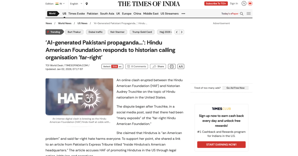 ”The Express Tribune piece was published on December 28, 2025, cites reports from groups such as Rutgers Law School and Political Research Associates. It argues that HAF plays a key role in shaping US discourse around India and Hindu identity.”