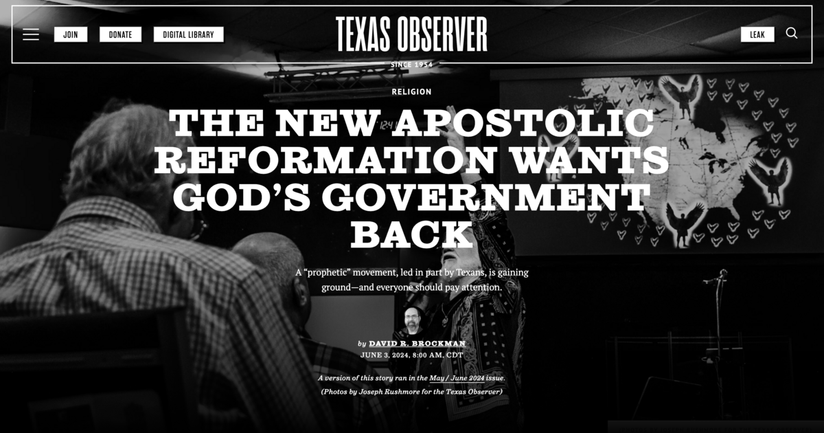 ”The NAR has deep roots in the Lone Star State, which is home to three of its leading ‘prophets’: Wallnau, Jacobs, and Corinth minister Chuck Pierce. (Specifically, all three hang their hats in Dallas-Fort Worth, the sprawling metro area that has spawned more than its fair share of extremists.) They ‘are among the most influential and politically important” of the ‘hundreds of apostles and prophets in the U.S.,’ said Frederick Clarkson, senior research analyst at Political Research Associates, a progressive think tank in Massachusetts. Their prophecies and teachings illuminate the NAR worldview and its politics—and indicate why we should be concerned about the “reformation” this movement seeks.”