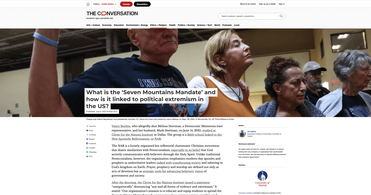 ”This belief system views pluralism as weakness, compromise as betrayal, and coexistence as capitulation. Frederick Clarkson, a senior research analyst at Political Research Associates, a progressive think tank based in Somerville, Massachusetts, defines the Seven Mountains Mandate [politicalresearch.org] as ‘the theocratic idea that Christians are called by God to exercise dominion over every aspect of society by taking control of political and cultural institutions.’”