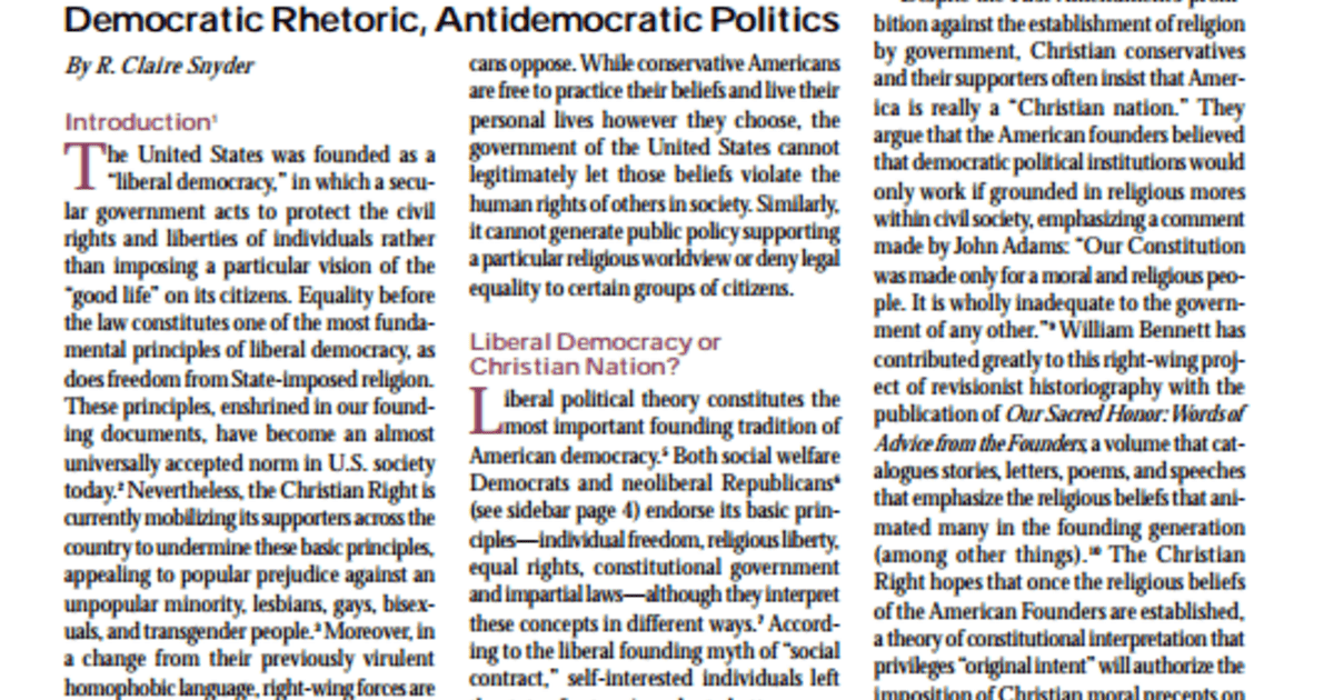 The United States was founded as a “liberal democracy,” in which a secular government acts to protect the civil rights and liberties of individuals rather than imposing a particular vision of the “good life” on its citizens.