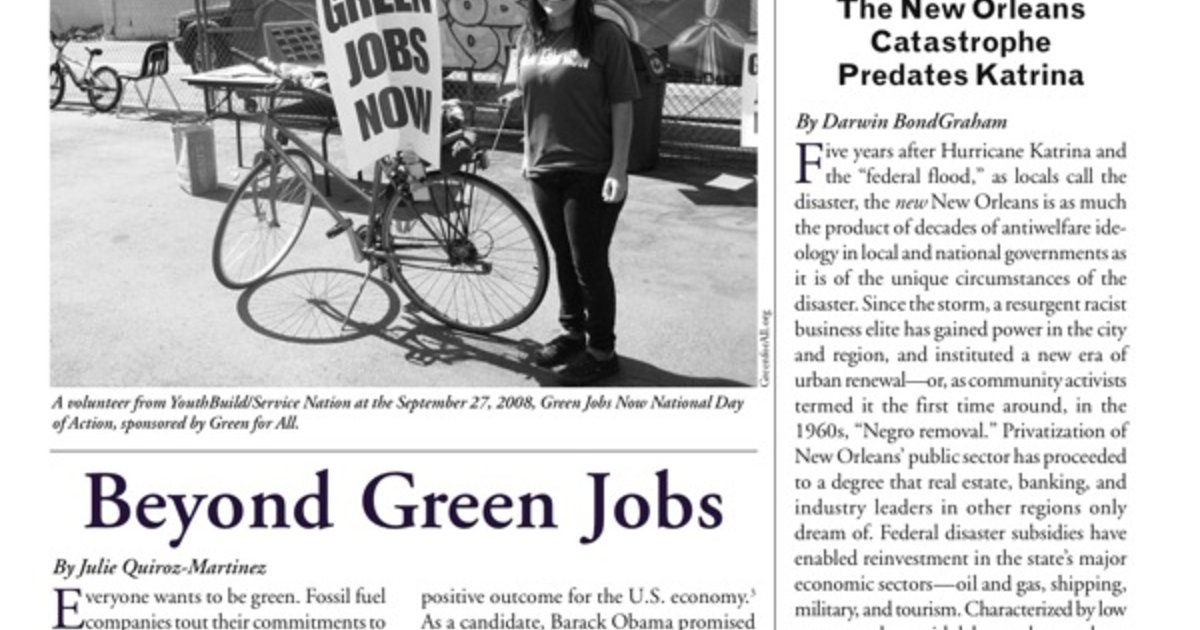 In the Fall 2010 issue, Julie Quiroz-Martinez describes the right-wing fight against green jobs and environmental and racial justice, Darwin BondGraham explores how the crisis of poverty and injustice in New Orleans predated Katrina, and Kapya Koama looks into how the U.S. religious right has introduced anti-gay attitudes into Africa.