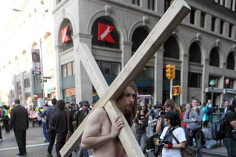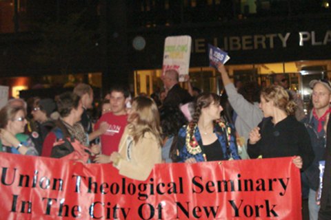 Recent analyses of religion in the 99% Movement tend to begin with a focus simply on pluralism, asking how diverse forms of religious transcendence—particularly in justice-minded congregations—have aligned themselves with the still-growing wave of Occupations. But the intimacy of life in a park or along a sidewalk is causing traditions to do something more than “coexist” plurally. Religions are colluding and combining.