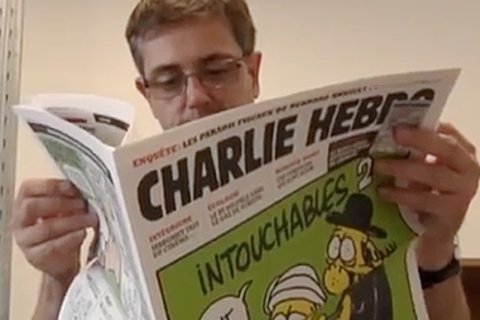 Why on earth is an orthodox Jew pushing a turbaned Muslim man in a wheelchair on the cover of Charlie Hebdo, the French baby-boomers’ favorite satirical magazine? Don’t bother looking for any deep symbolism—you won’t find it.