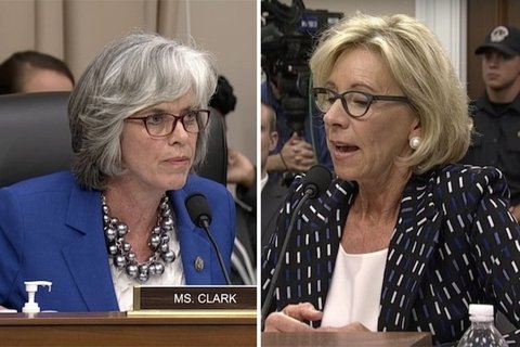 In a tense exchange with Massachusetts Rep. Katherine Clark on Wednesday, Secretary of Education Betsy DeVos refused to identify a single example of discriminatory policies that would make a private…