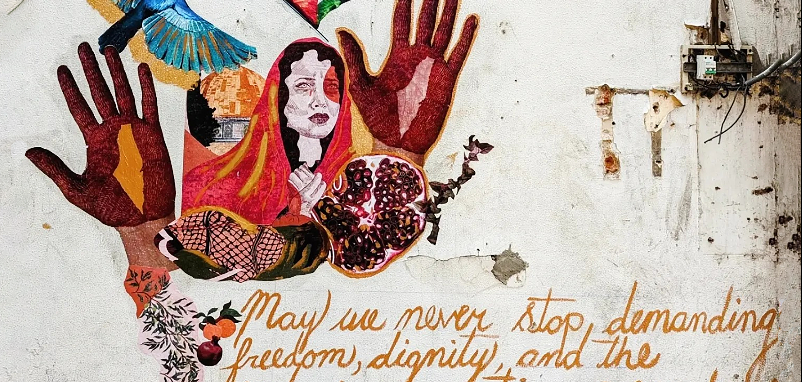 The idea for this street art was sparked by a conversation with ‘J,’ an independent writer who traces intimate geographies in writing about the connections between people and place, during the Fearless Collective’s retreat in Colombo, Sri Lanka. She admired the henna artwork I created for Palestine and envisioned creating a large poster of the artwork on a tall building. We didn’t have enough time and instead did a smaller scale paste-up with Palestine solidarity posters that were created and designed by artists like Pionica Fernando, Ismagul Hasan, Shilo Shiv Suleiman, and Kimsuka in response to the Fearless Collective’s call to artists. We picked a few different posters with fragments of reclamation, liberation, and power and cut out elements from each poster: a Palestinian woman, sunbird, hands with the Palestine map, a pomegranate.